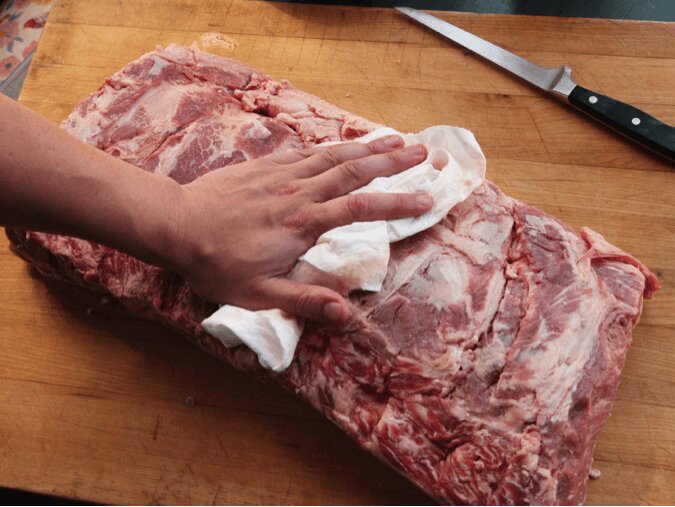 1. Еще раз промокните насухо хлопковым полотенцем оставшуюся часть говяжьего отруба;