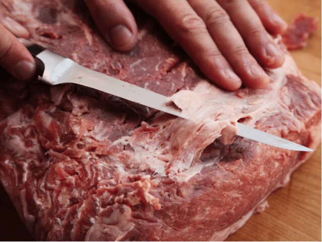 2. В зависимости от предпочтений с помощью острого, повторюсь — острого ножа!, срезаете лишние жировые волокна на сторонах отруба. Если вы приобрели отруб