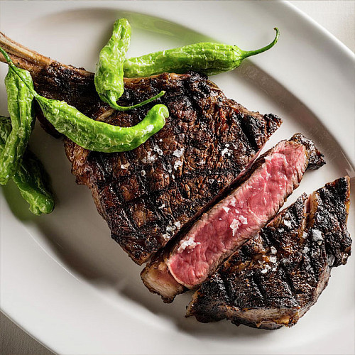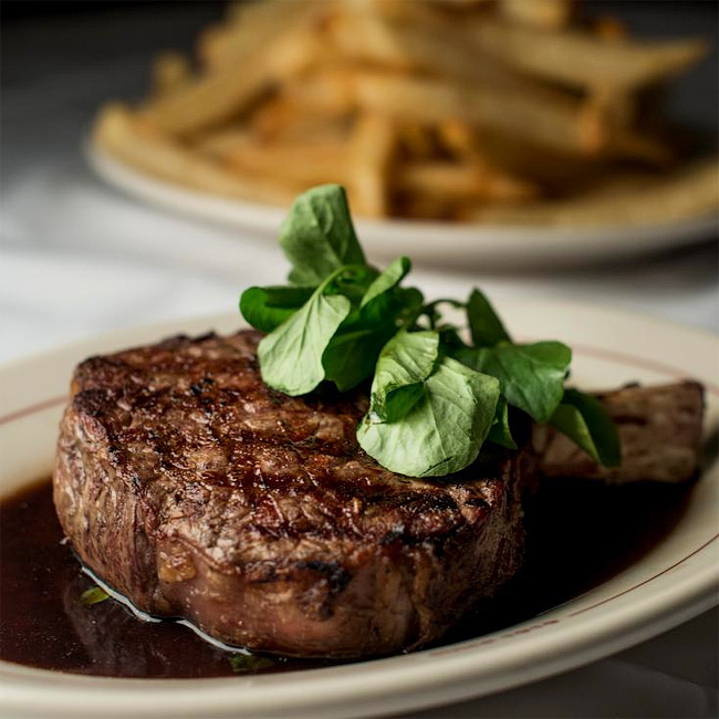 Стейк Ковбой — это Рибай, подающийся на коротком, зачищенном ребре. Кость при жарке придает стейку приятный ореховый аромат.