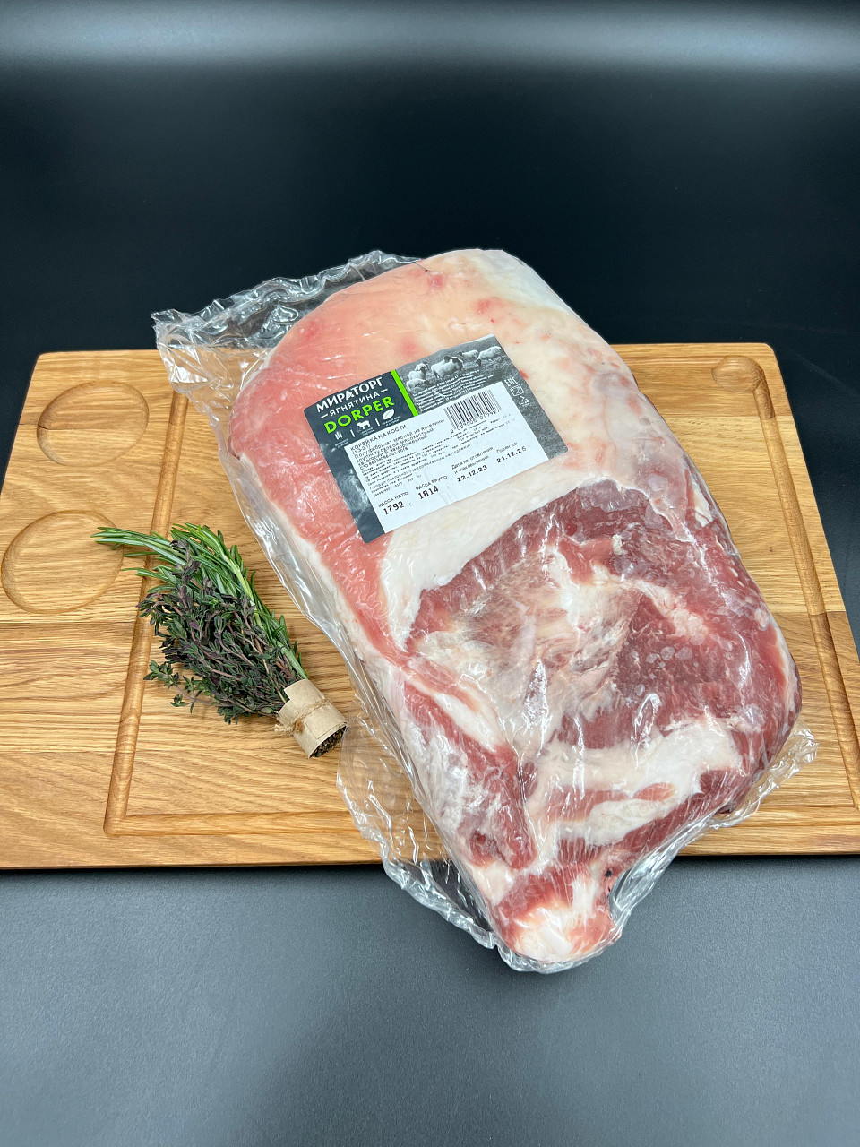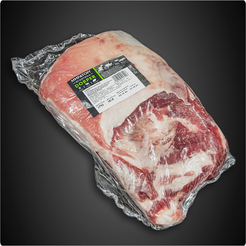 Нежное мясо ягнят южноафриканской породы Dorper с тонкими и равномерными прослойками жира, не старше 4 месяцев. Обладает нежным запахом с тонкими молочными нотками. Выращены в Курской области на натуральных кормах с добавлением зернового откорма.