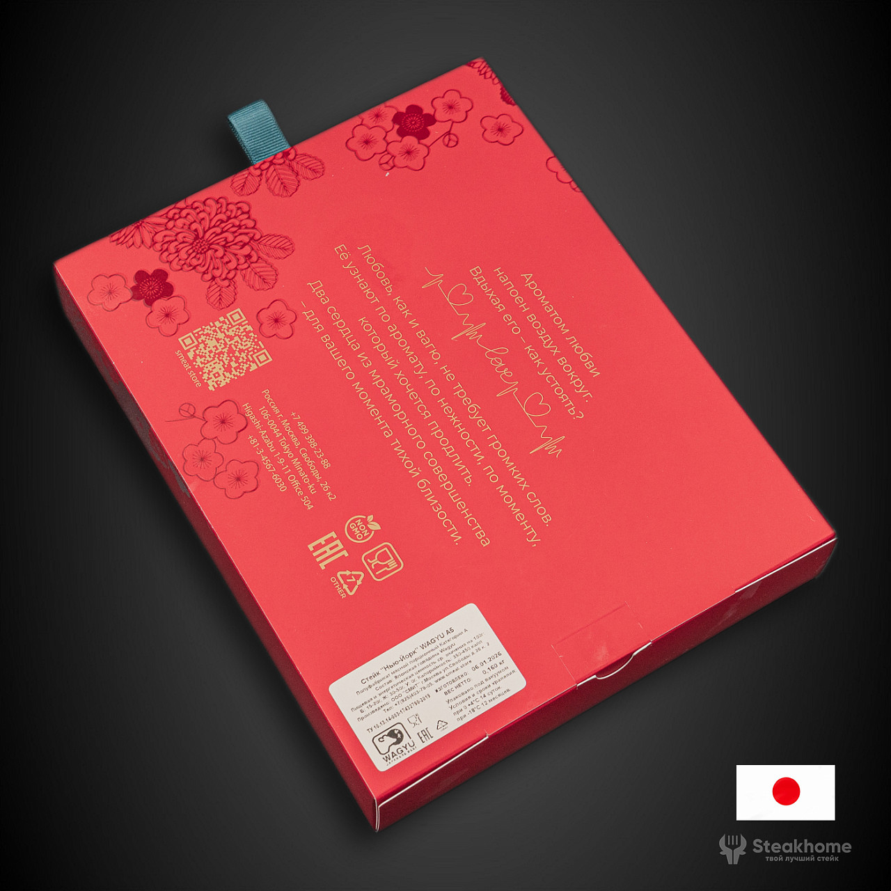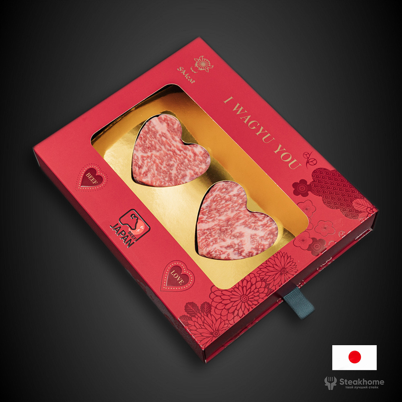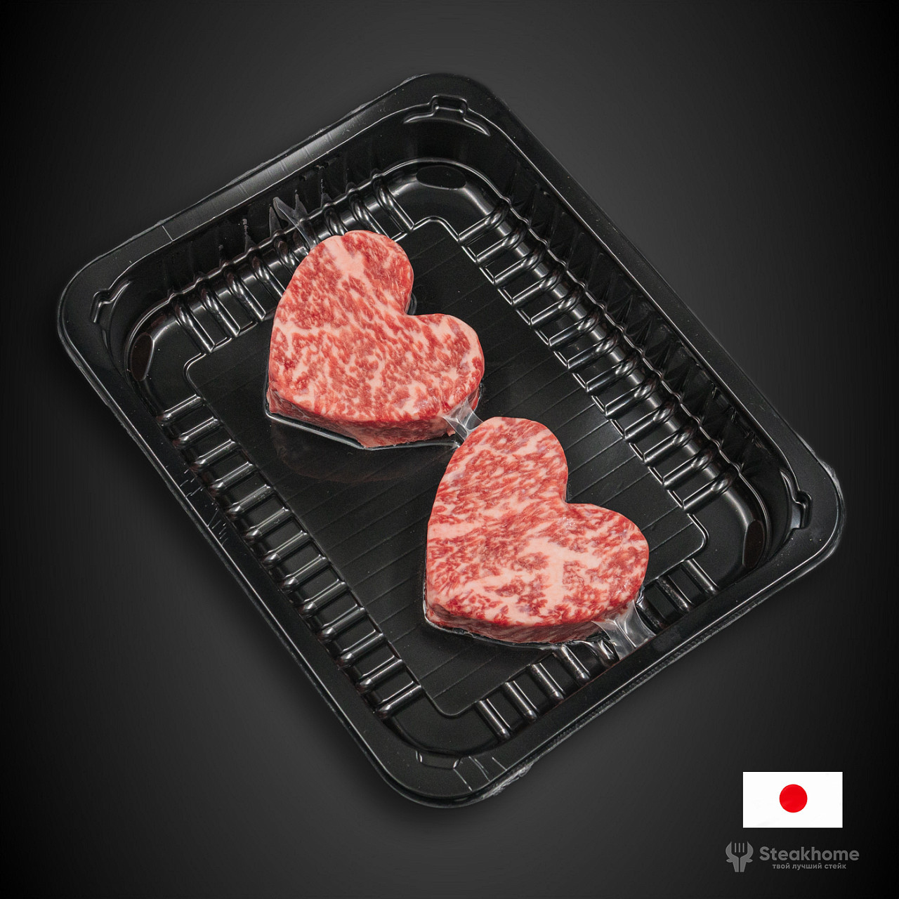 В наборе — два стейка в форме сердца, вырезанные из стриплойна высочайшей категории. Легендарная мраморность, тончайшие прожилки жира, которые тают при температуре тела, глубокий сливочно-ореховый вкус и та самая текстура, за которую японское Wagyu ценят во всём мире.