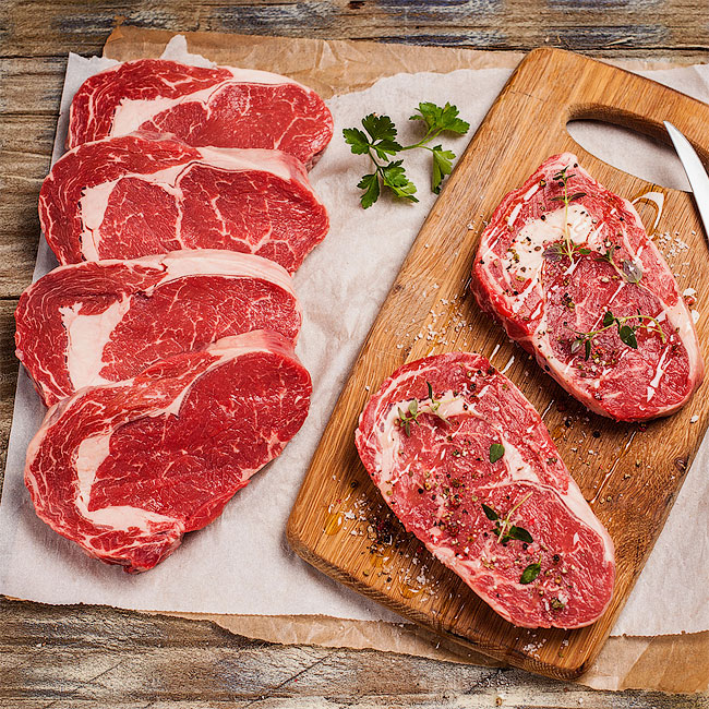 1/2 отруба Рибай. Отруб Рибай Чойс (Choice) кукурузного откорма от 180 дней — это идеал в мире стейков. Классика, с которой так или иначе знаком каждый, кто интересуется мясной культурой. На языке мясников «рибай» обозначает «край на ребре», самый мясистый отруб из передней части туши. Стейк состоит из одной большой мышцы и нескольких поменьше. Рассмотрев его, вы заметите тонкие жировые прослойки, напоминающие узор на мраморе — отсюда и пошла классификация мяса по «мраморности». Рибай кукурузного откорма подходит для настоящих любителей стейков с ярко выраженным мясным вкусом.