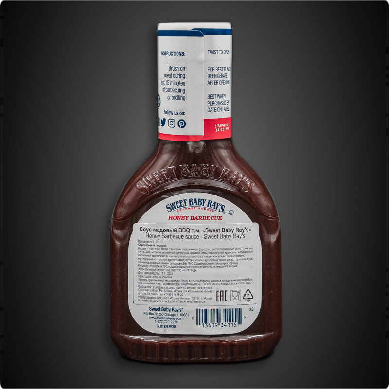Подсластите свои блюда медовым соусом для барбекю Sweet Baby Ray’s Honey Barbecue Sauce. Используйте его при приготовлении на гриле или на плите. В 1985 году известный американский шеф-повар Ларри Рэймонд усовершенствовал соус барбекю на основе старинного семейного рецепта и добился поразительных результатов. Этот удивительно вкусный, сладко-острый соус на основе ананасового сока и мелассы победил на крупнейшей в стране выставке по приготовлению ребрышек на гриле. Соус получил название по прозвищу своего создателя, которое он получил, играя в баскетбольной команде в Чикаго — Sweet Baby Ray ("Славный малыш Рэй"). Соус оказался настолько удачным, что победил более чем на 700 соревнованиях. В течение года Ларри вместе со своим школьным другом Майком О'Брайеном основали компанию и на основе популярного соуса создали целую линейку продуктов для BBQ.Создавайте уникальные кулинарные шедевры с популярным в США соусом барбекю, который используют профессиональные команды поваров на чемпионатах BBQ.
