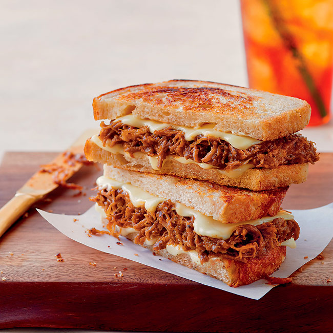 Рву руками свежий французский багет: кусочек грудинки и заправка с огурчиками сверху. Лично я съел, кажется, пять таких. Я был очень доволен. Еще бы, настолько долгим было ожидание. Скажу без тени сомнения — это идеальное блюдо, которое просто приготовить дома для большой компании или семейного торжества.