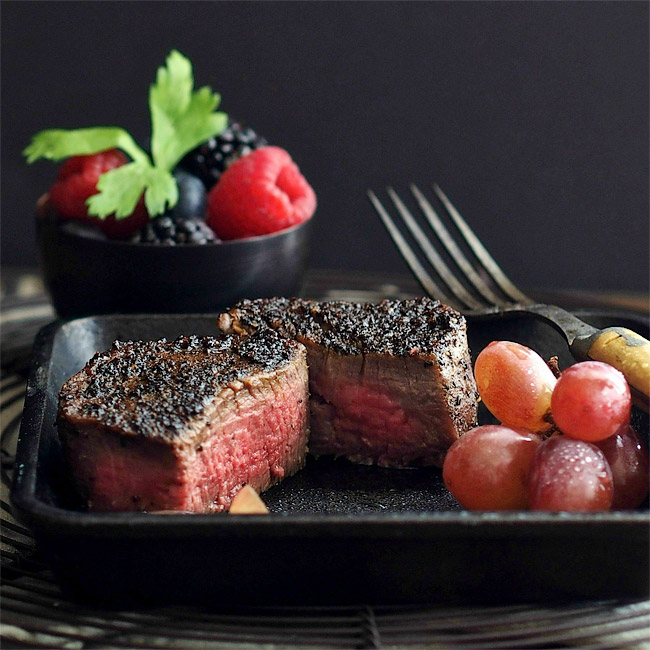 кусок говяжьей вырезки, который только можно купить (или заказать с доставкой по Москве в день обращения) в нашей мясной лавке. Соль крупного помола и свежий молотый перец — все, что вам нужно для вкуснейшего стейка, который обжаривается на сковороде, а затем доводится до совершенства в духовке! Сам я люблю стейк слабой прожарки, но вы можете приготовить его по своему вкусу.